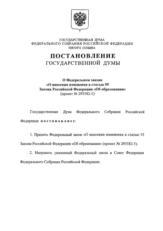 "О ФЕДЕРАЛЬНОМ ЗАКОНЕ "О ВНЕСЕНИИ ИЗМЕНЕНИЯ В СТАТЬЮ 55 ЗАКОНА РОССИЙСКОЙ ФЕДЕРАЦИИ "ОБ ОБРАЗОВАНИИ" (ПРОЕКТ N 293582-5)"