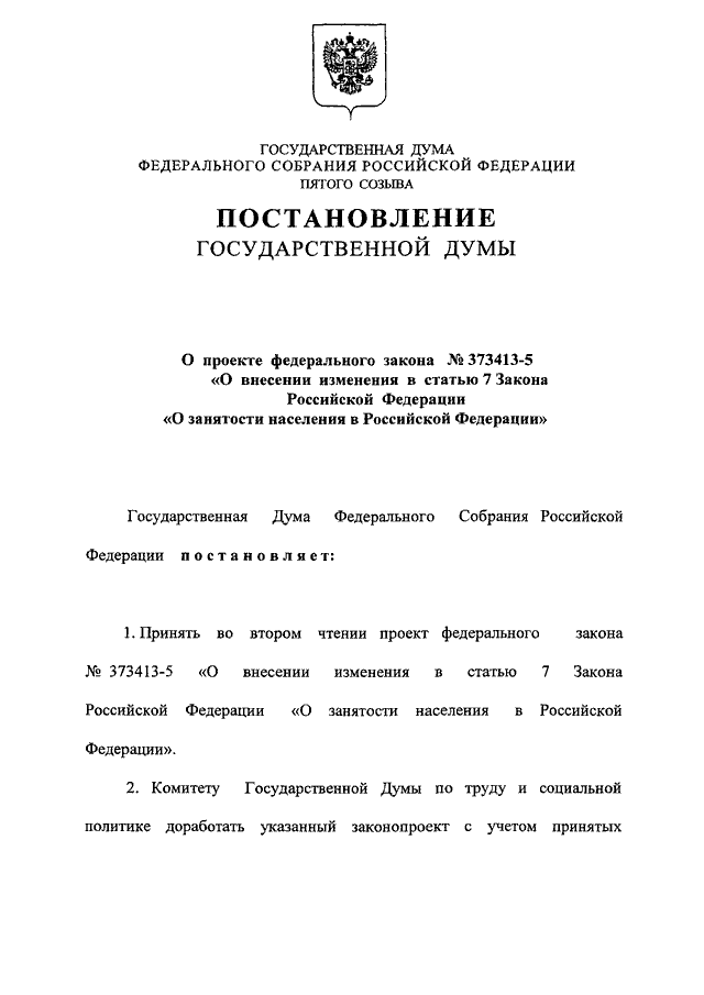 "О ПРОЕКТЕ ФЕДЕРАЛЬНОГО ЗАКОНА N 373413-5 "О ВНЕСЕНИИ ИЗМЕНЕНИЯ В СТАТЬЮ 7 ЗАКОНА РОССИЙСКОЙ ФЕДЕРАЦИИ "О ЗАНЯТОСТИ НАСЕЛЕНИЯ В РОССИЙСКОЙ ФЕДЕРАЦИИ"