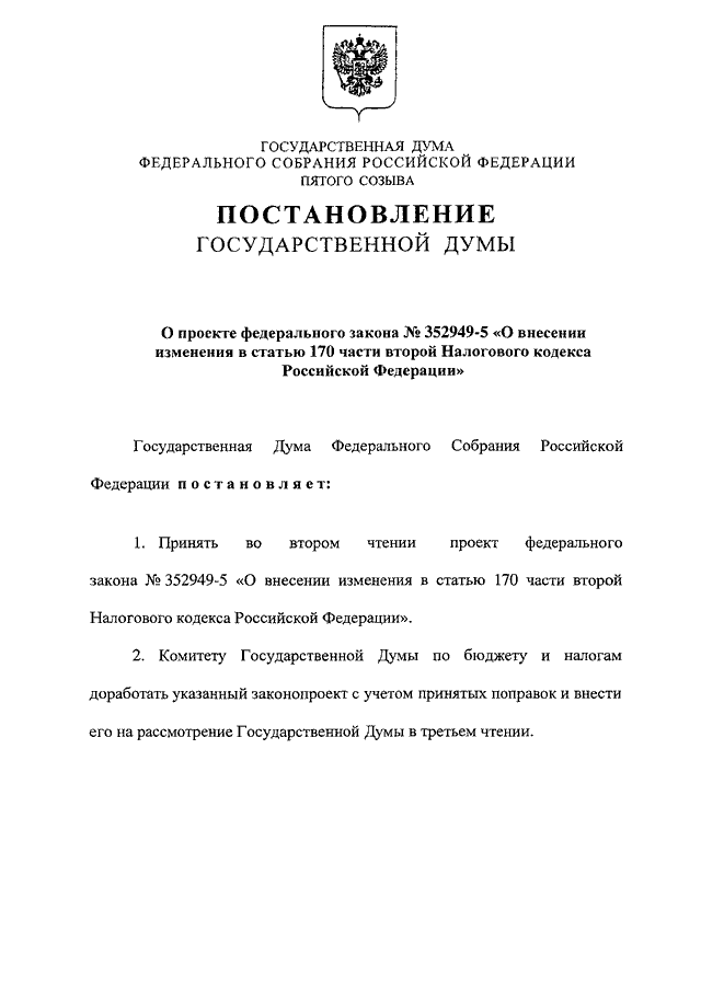 "О ПРОЕКТЕ ФЕДЕРАЛЬНОГО ЗАКОНА N 352949-5 "О ВНЕСЕНИИ ИЗМЕНЕНИЯ В СТАТЬЮ 170 ЧАСТИ ВТОРОЙ НАЛОГОВОГО КОДЕКСА РОССИЙСКОЙ ФЕДЕРАЦИИ"