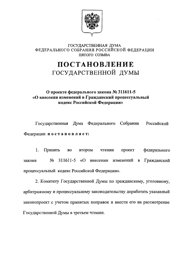 "О ПРОЕКТЕ ФЕДЕРАЛЬНОГО ЗАКОНА N 311611-5 "О ВНЕСЕНИИ ИЗМЕНЕНИЙ В ГРАЖДАНСКИЙ ПРОЦЕССУАЛЬНЫЙ КОДЕКС РОССИЙСКОЙ ФЕДЕРАЦИИ"
