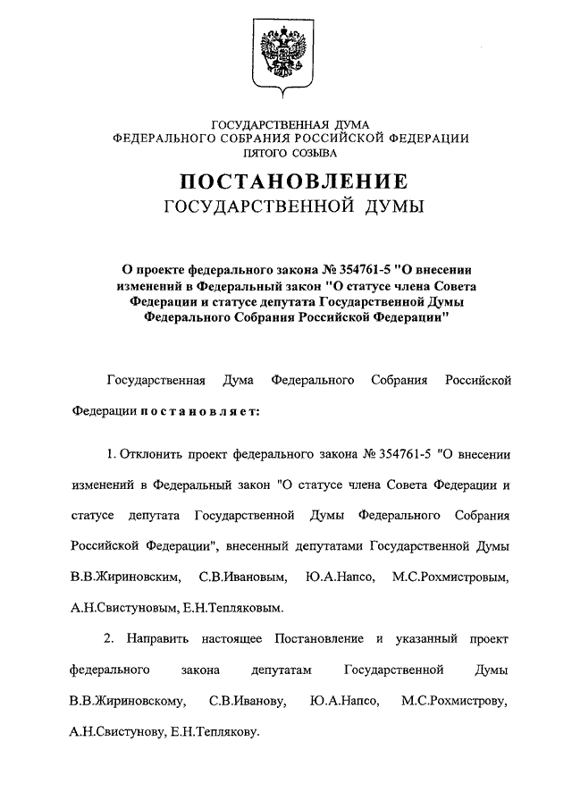 "О ПРОЕКТЕ ФЕДЕРАЛЬНОГО ЗАКОНА N 354761-5 "О ВНЕСЕНИИ ИЗМЕНЕНИЙ В