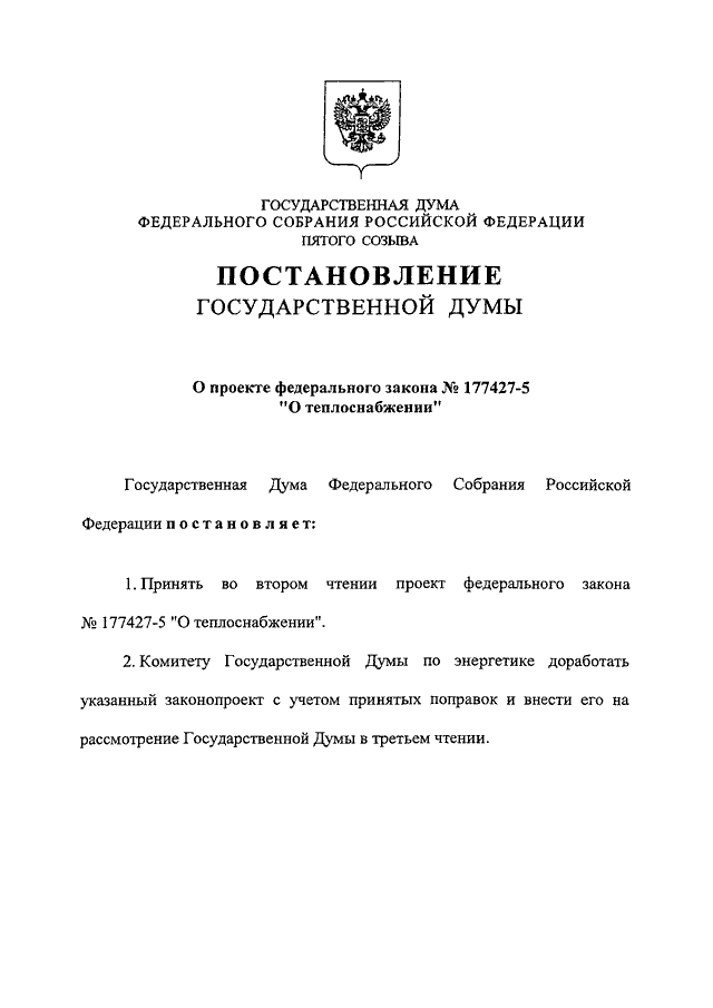 "О ПРОЕКТЕ ФЕДЕРАЛЬНОГО ЗАКОНА N 177427-5 "О ТЕПЛОСНАБЖЕНИИ"
