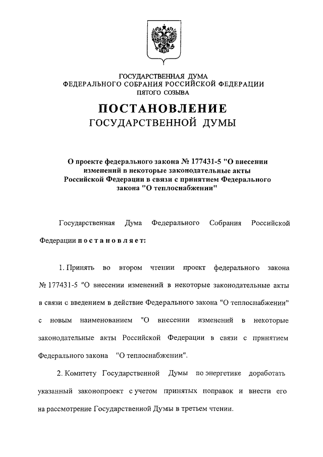 "О ПРОЕКТЕ ФЕДЕРАЛЬНОГО ЗАКОНА N 177431-5 "О ВНЕСЕНИИ ИЗМЕНЕНИЙ В НЕКОТОРЫЕ ЗАКОНОДАТЕЛЬНЫЕ АКТЫ РОССИЙСКОЙ ФЕДЕРАЦИИ В СВЯЗИ С ПРИНЯТИЕМ ФЕДЕРАЛЬНОГО ЗАКОНА "О ТЕПЛОСНАБЖЕНИИ"