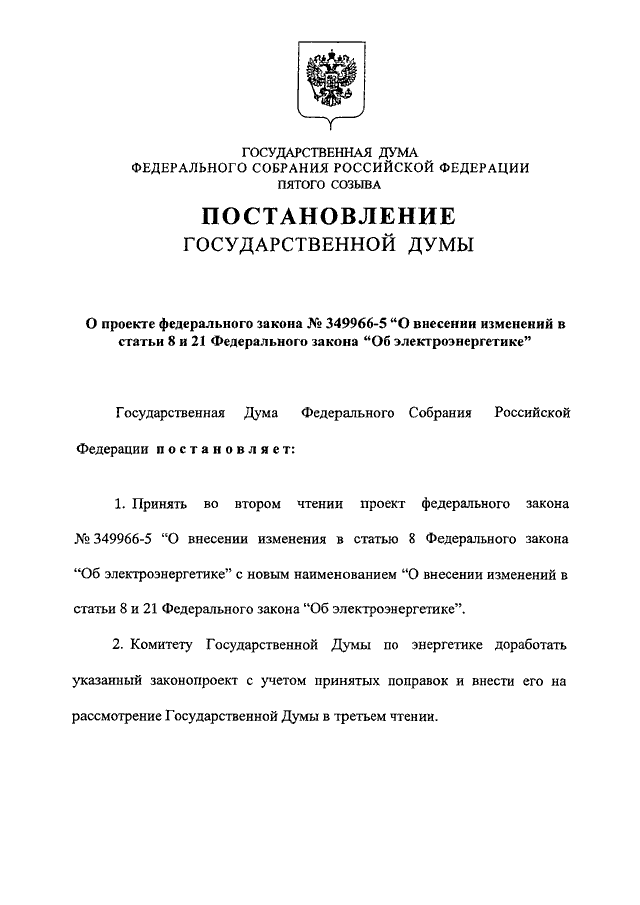 "О ПРОЕКТЕ ФЕДЕРАЛЬНОГО ЗАКОНА N 349966-5 "О ВНЕСЕНИИ ИЗМЕНЕНИЙ В СТАТЬИ 8 И 21 ФЕДЕРАЛЬНОГО ЗАКОНА "ОБ ЭЛЕКТРОЭНЕРГЕТИКЕ"