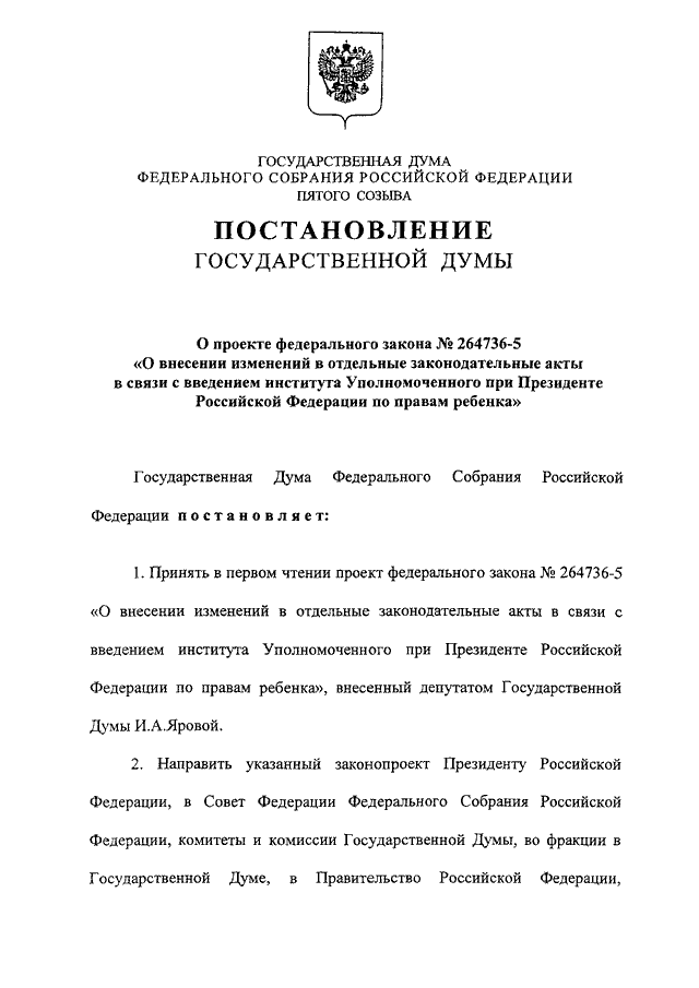 "О ПРОЕКТЕ ФЕДЕРАЛЬНОГО ЗАКОНА N 264736-5 "О ВНЕСЕНИИ ИЗМЕНЕНИЙ В ОТДЕЛЬНЫЕ ЗАКОНОДАТЕЛЬНЫЕ АКТЫ В СВЯЗИ С ВВЕДЕНИЕМ ИНСТИТУТА УПОЛНОМОЧЕННОГО ПРИ ПРЕЗИДЕНТЕ РОССИЙСКОЙ ФЕДЕРАЦИИ ПО ПРАВАМ РЕБЕНКА"