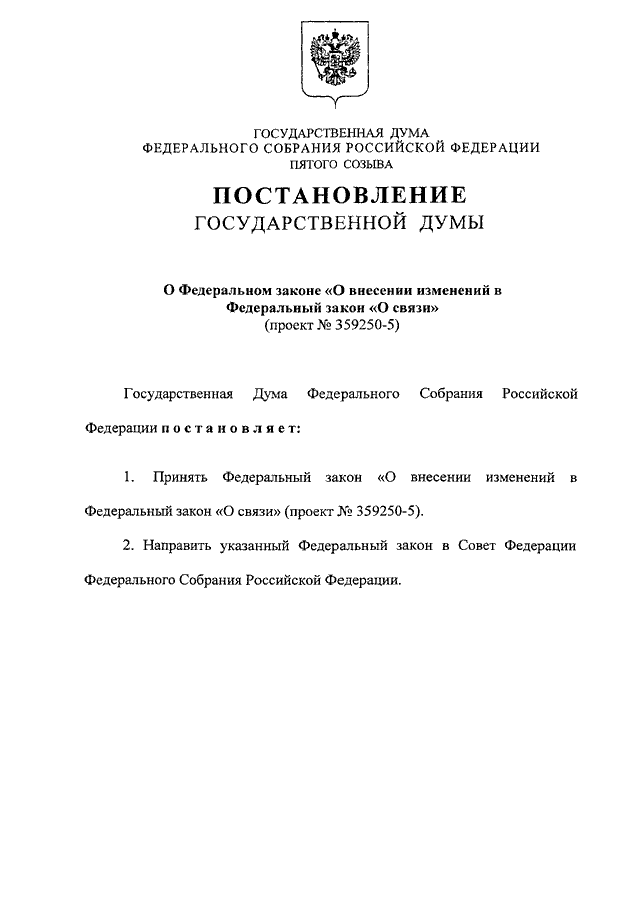 "О ФЕДЕРАЛЬНОМ ЗАКОНЕ "О ВНЕСЕНИИ ИЗМЕНЕНИЙ В ФЕДЕРАЛЬНЫЙ ЗАКОН "О СВЯЗИ" (ПРОЕКТ N 359250-5)"