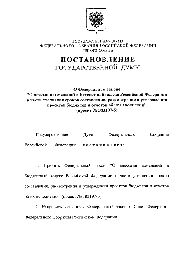 "О ФЕДЕРАЛЬНОМ ЗАКОНЕ "О ВНЕСЕНИИ ИЗМЕНЕНИЙ В БЮДЖЕТНЫЙ КОДЕКС РОССИЙСКОЙ ФЕДЕРАЦИИ В ЧАСТИ УТОЧНЕНИЯ СРОКОВ СОСТАВЛЕНИЯ, РАССМОТРЕНИЯ И УТВЕРЖДЕНИЯ ПРОЕКТОВ БЮДЖЕТОВ И ОТЧЕТОВ ОБ ИХ ИСПОЛНЕНИИ" (ПРОЕКТ N 383197-5)"