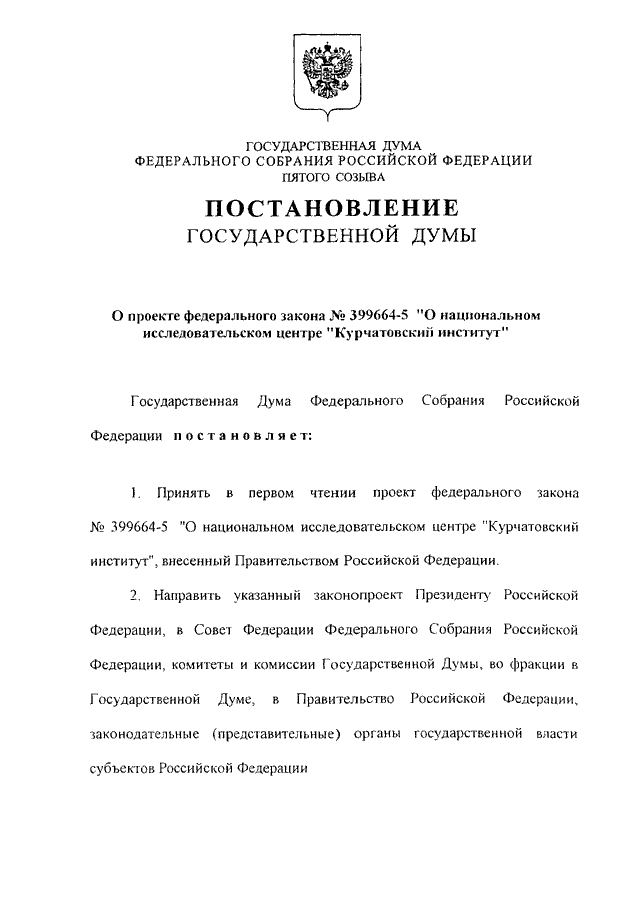 "О ПРОЕКТЕ ФЕДЕРАЛЬНОГО ЗАКОНА N 399664-5 "О НАЦИОНАЛЬНОМ ИССЛЕДОВАТЕЛЬСКОМ ЦЕНТРЕ "КУРЧАТОВСКИЙ ИНСТИТУТ"
