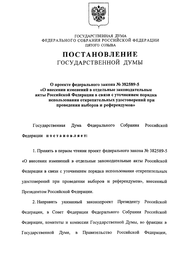 "О ПРОЕКТЕ ФЕДЕРАЛЬНОГО ЗАКОНА N 382589-5 "О ВНЕСЕНИИ ИЗМЕНЕНИЙ В ОТДЕЛЬНЫЕ ЗАКОНОДАТЕЛЬНЫЕ АКТЫ РОССИЙСКОЙ ФЕДЕРАЦИИ В СВЯЗИ С УТОЧНЕНИЕМ ПОРЯДКА ИСПОЛЬЗОВАНИЯ ОТКРЕПИТЕЛЬНЫХ УДОСТОВЕРЕНИЙ ПРИ ПРОВЕДЕНИИ ВЫБОРОВ И РЕФЕРЕНДУМОВ"