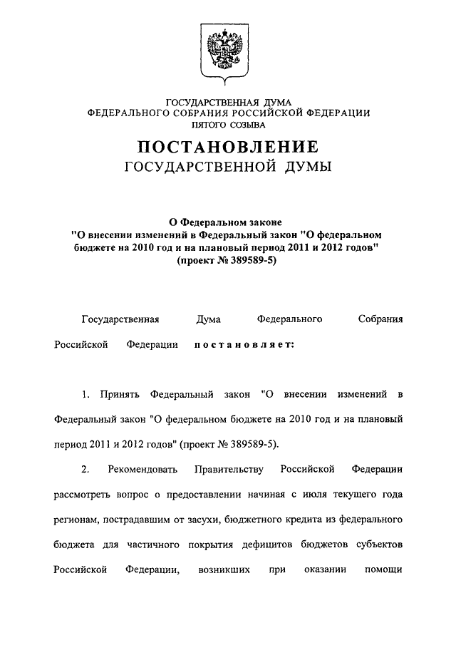 "О ФЕДЕРАЛЬНОМ ЗАКОНЕ "О ВНЕСЕНИИ ИЗМЕНЕНИЙ В ФЕДЕРАЛЬНЫЙ ЗАКОН "О ФЕДЕРАЛЬНОМ БЮДЖЕТЕ НА 2010 ГОД И НА ПЛАНОВЫЙ ПЕРИОД 2011 И 2012 ГОДОВ" (ПРОЕКТ N 389589-5)"