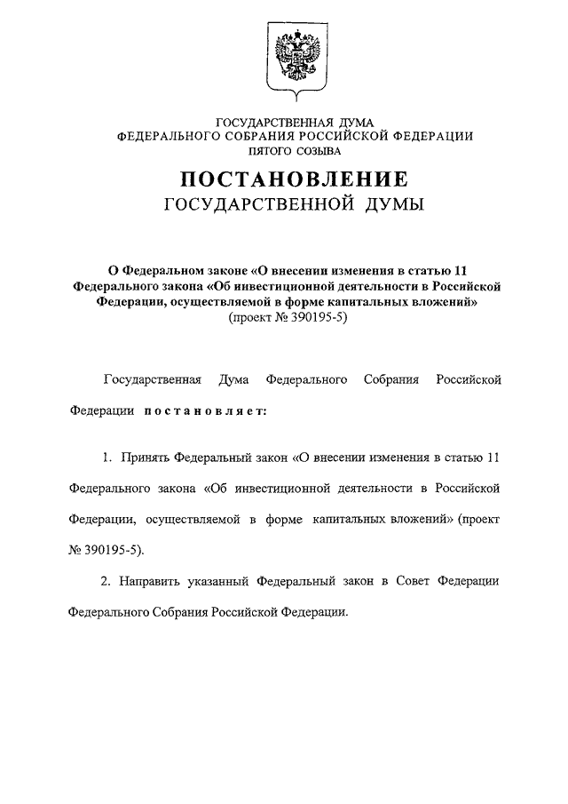 "О ФЕДЕРАЛЬНОМ ЗАКОНЕ "О ВНЕСЕНИИ ИЗМЕНЕНИЯ В СТАТЬЮ 11 ФЕДЕРАЛЬНОГО ЗАКОНА "ОБ ИНВЕСТИЦИОННОЙ ДЕЯТЕЛЬНОСТИ В РОССИЙСКОЙ ФЕДЕРАЦИИ, ОСУЩЕСТВЛЯЕМОЙ В ФОРМЕ КАПИТАЛЬНЫХ ВЛОЖЕНИЙ" (ПРОЕКТ N 390195-5)"