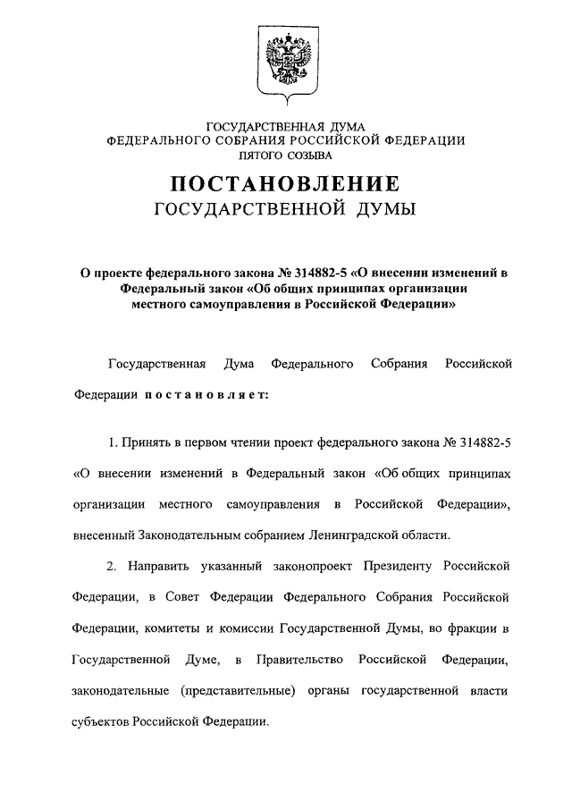 "О ПРОЕКТЕ ФЕДЕРАЛЬНОГО ЗАКОНА N 314882-5 "О ВНЕСЕНИИ ИЗМЕНЕНИЙ В ФЕДЕРАЛЬНЫЙ ЗАКОН "ОБ ОБЩИХ ПРИНЦИПАХ ОРГАНИЗАЦИИ МЕСТНОГО САМОУПРАВЛЕНИЯ В РОССИЙСКОЙ ФЕДЕРАЦИИ"