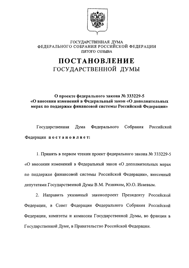 "О ПРОЕКТЕ ФЕДЕРАЛЬНОГО ЗАКОНА N 333229-5 "О ВНЕСЕНИИ ИЗМЕНЕНИЙ В ФЕДЕРАЛЬНЫЙ ЗАКОН "О ДОПОЛНИТЕЛЬНЫХ МЕРАХ ПО ПОДДЕРЖКЕ ФИНАНСОВОЙ СИСТЕМЫ РОССИЙСКОЙ ФЕДЕРАЦИИ"