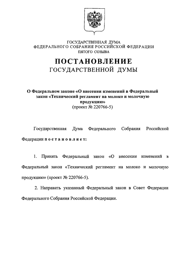 "О ФЕДЕРАЛЬНОМ ЗАКОНЕ "О ВНЕСЕНИИ ИЗМЕНЕНИЙ В ФЕДЕРАЛЬНЫЙ ЗАКОН "ТЕХНИЧЕСКИЙ РЕГЛАМЕНТ НА МОЛОКО И МОЛОЧНУЮ ПРОДУКЦИЮ" (ПРОЕКТ N 220766-5)"