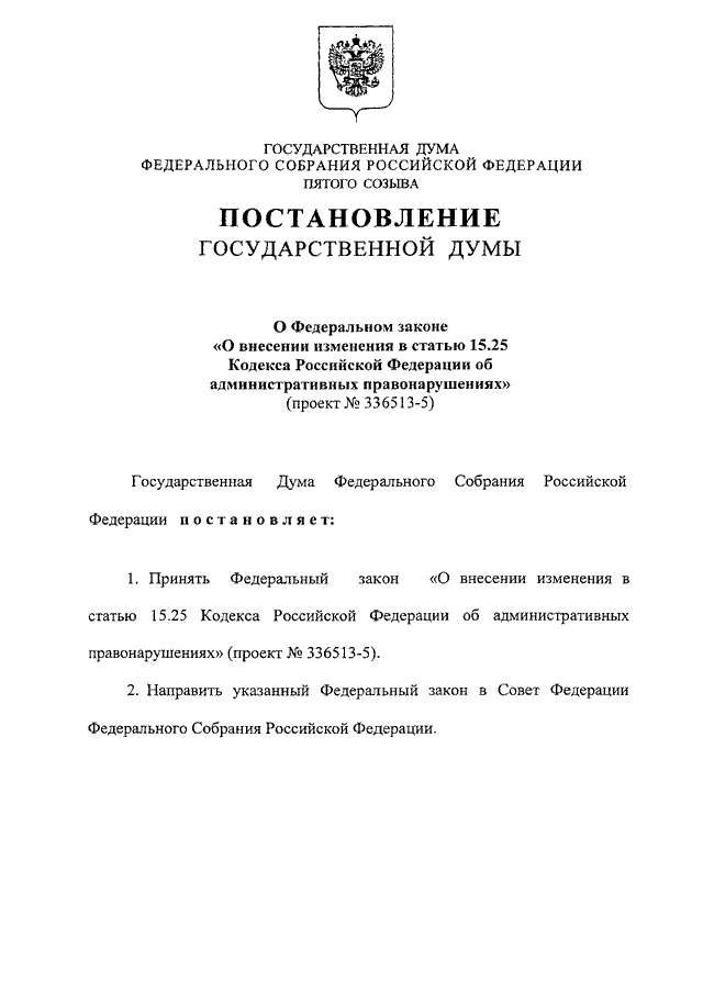 "О ФЕДЕРАЛЬНОМ ЗАКОНЕ "О ВНЕСЕНИИ ИЗМЕНЕНИЯ В СТАТЬЮ 15.25 КОДЕКСА РОССИЙСКОЙ ФЕДЕРАЦИИ ОБ АДМИНИСТРАТИВНЫХ ПРАВОНАРУШЕНИЯХ" (ПРОЕКТ N 336513-5)"