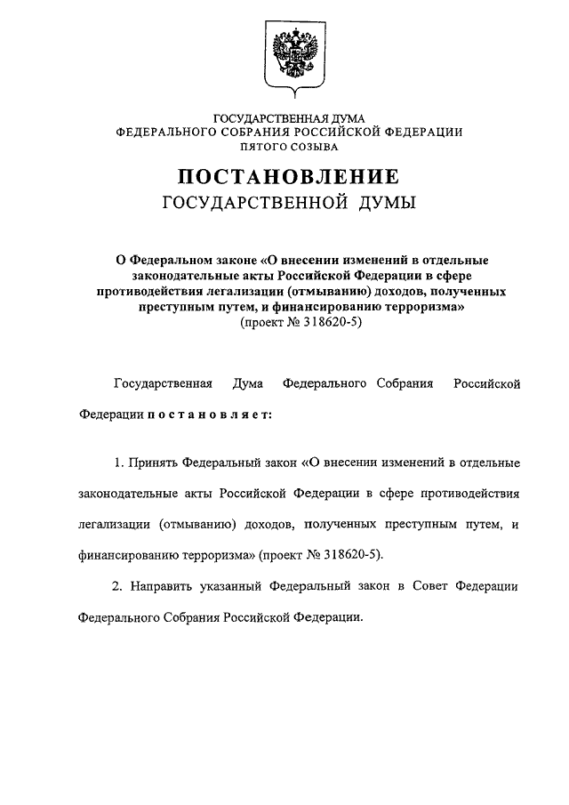 "О ФЕДЕРАЛЬНОМ ЗАКОНЕ "О ВНЕСЕНИИ ИЗМЕНЕНИЙ В ОТДЕЛЬНЫЕ ЗАКОНОДАТЕЛЬНЫЕ АКТЫ РОССИЙСКОЙ ФЕДЕРАЦИИ В СФЕРЕ ПРОТИВОДЕЙСТВИЯ ЛЕГАЛИЗАЦИИ (ОТМЫВАНИЮ) ДОХОДОВ, ПОЛУЧЕННЫХ ПРЕСТУПНЫМ ПУТЕМ, И ФИНАНСИРОВАНИЮ ТЕРРОРИЗМА" (ПРОЕКТ N 318620-5)"