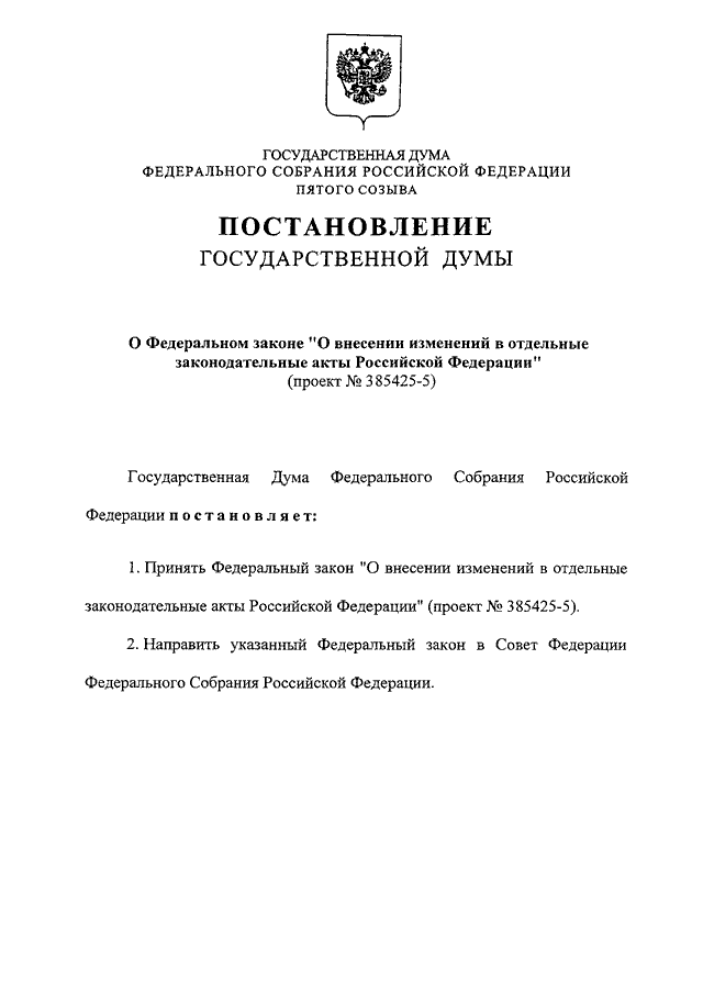 "О ФЕДЕРАЛЬНОМ ЗАКОНЕ "О ВНЕСЕНИИ ИЗМЕНЕНИЙ В ОТДЕЛЬНЫЕ ЗАКОНОДАТЕЛЬНЫЕ АКТЫ РОССИЙСКОЙ ФЕДЕРАЦИИ" (ПРОЕКТ N 385425-5)"