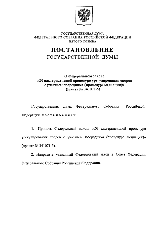 "О ФЕДЕРАЛЬНОМ ЗАКОНЕ "ОБ АЛЬТЕРНАТИВНОЙ ПРОЦЕДУРЕ УРЕГУЛИРОВАНИЯ СПОРОВ С УЧАСТИЕМ ПОСРЕДНИКА (ПРОЦЕДУРЕ МЕДИАЦИИ)" (ПРОЕКТ N 341071-5)"