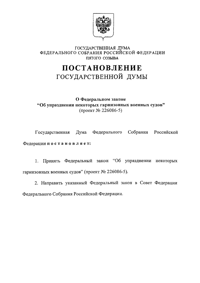 "О ФЕДЕРАЛЬНОМ ЗАКОНЕ "ОБ УПРАЗДНЕНИИ НЕКОТОРЫХ ГАРНИЗОННЫХ ВОЕННЫХ СУДОВ" (ПРОЕКТ N 226086-5)"