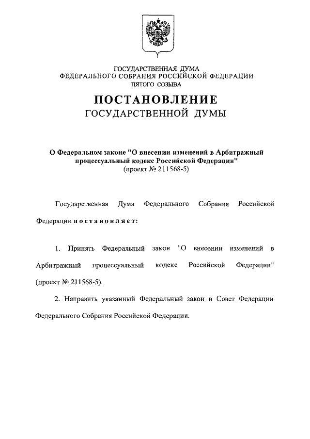 "О ФЕДЕРАЛЬНОМ ЗАКОНЕ "О ВНЕСЕНИИ ИЗМЕНЕНИЙ В АРБИТРАЖНЫЙ ПРОЦЕССУАЛЬНЫЙ КОДЕКС РОССИЙСКОЙ ФЕДЕРАЦИИ" (ПРОЕКТ N 211568-5)"