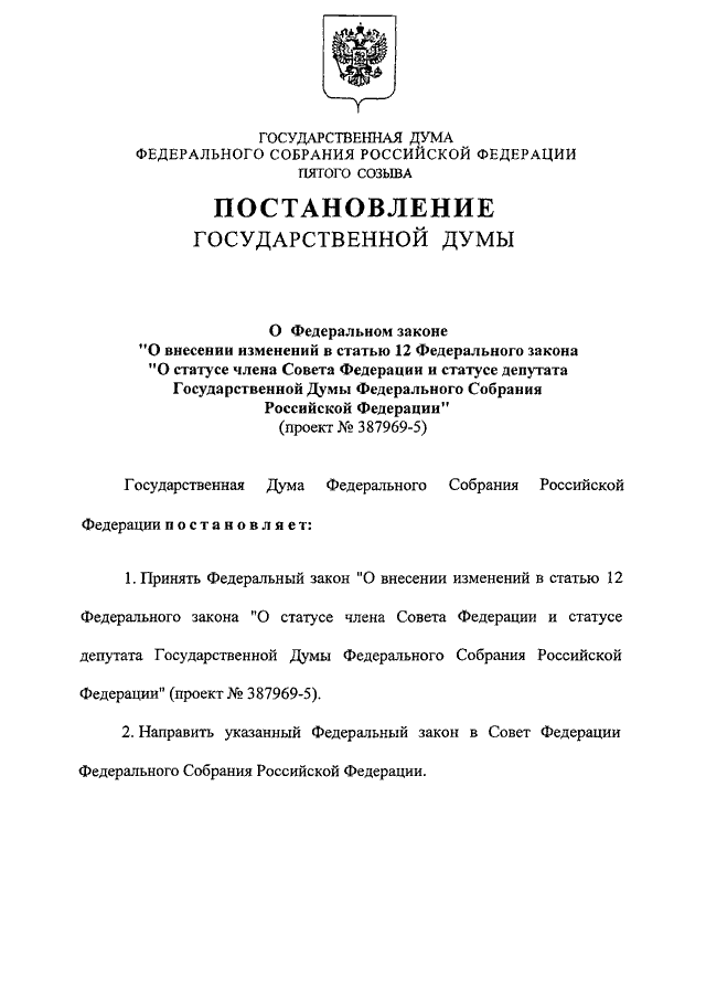 "О ФЕДЕРАЛЬНОМ ЗАКОНЕ "О ВНЕСЕНИИ ИЗМЕНЕНИЙ В СТАТЬЮ 12 ФЕДЕРАЛЬНОГО ЗАКОНА "О СТАТУСЕ ЧЛЕНА СОВЕТА ФЕДЕРАЦИИ И СТАТУСЕ ДЕПУТАТА ГОСУДАРСТВЕННОЙ ДУМЫ ФЕДЕРАЛЬНОГО СОБРАНИЯ РОССИЙСКОЙ ФЕДЕРАЦИИ" (ПРОЕКТ N 387969-5)"