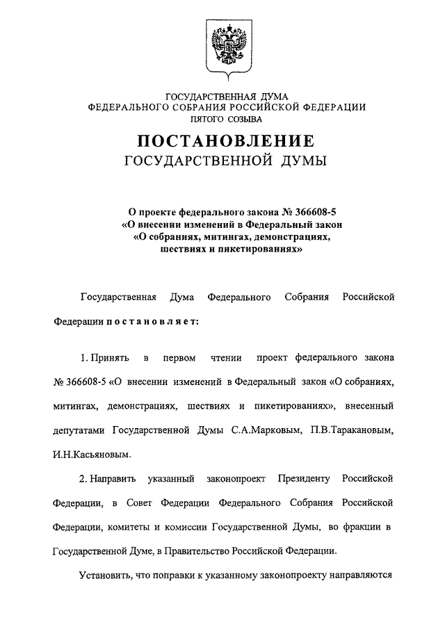 "О ПРОЕКТЕ ФЕДЕРАЛЬНОГО ЗАКОНА N 366608-5 "О ВНЕСЕНИИ ИЗМЕНЕНИЙ В ФЕДЕРАЛЬНЫЙ ЗАКОН "О СОБРАНИЯХ, МИТИНГАХ, ДЕМОНСТРАЦИЯХ, ШЕСТВИЯХ И ПИКЕТИРОВАНИЯХ"
