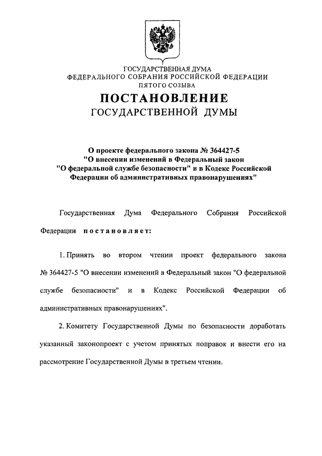 "О ПРОЕКТЕ ФЕДЕРАЛЬНОГО ЗАКОНА N 364427-5 "О ВНЕСЕНИИ ИЗМЕНЕНИЙ В ФЕДЕРАЛЬНЫЙ ЗАКОН "О ФЕДЕРАЛЬНОЙ СЛУЖБЕ БЕЗОПАСНОСТИ" И В КОДЕКС РОССИЙСКОЙ ФЕДЕРАЦИИ ОБ АДМИНИСТРАТИВНЫХ ПРАВОНАРУШЕНИЯХ"
