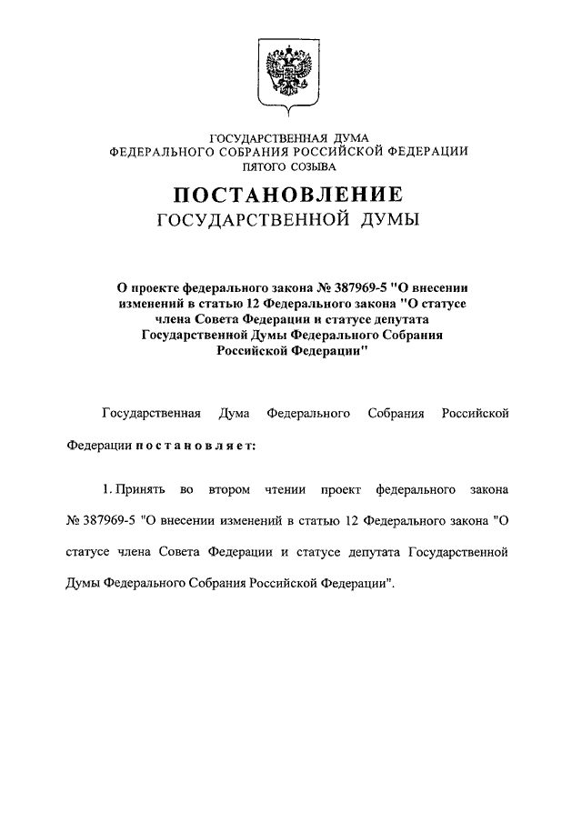 СТАТУСЕ ДЕПУТАТА ГОСУДАРСТВЕННОЙ ДУМЫ ФЕДЕРАЛЬНОГО СОБРАНИЯ