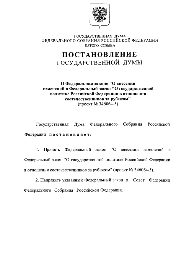 "О ФЕДЕРАЛЬНОМ ЗАКОНЕ "О ВНЕСЕНИИ ИЗМЕНЕНИЙ В ФЕДЕРАЛЬНЫЙ ЗАКОН "О ГОСУДАРСТВЕННОЙ ПОЛИТИКЕ РОССИЙСКОЙ ФЕДЕРАЦИИ В ОТНОШЕНИИ СООТЕЧЕСТВЕННИКОВ ЗА РУБЕЖОМ" (ПРОЕКТ N 346064-5)"