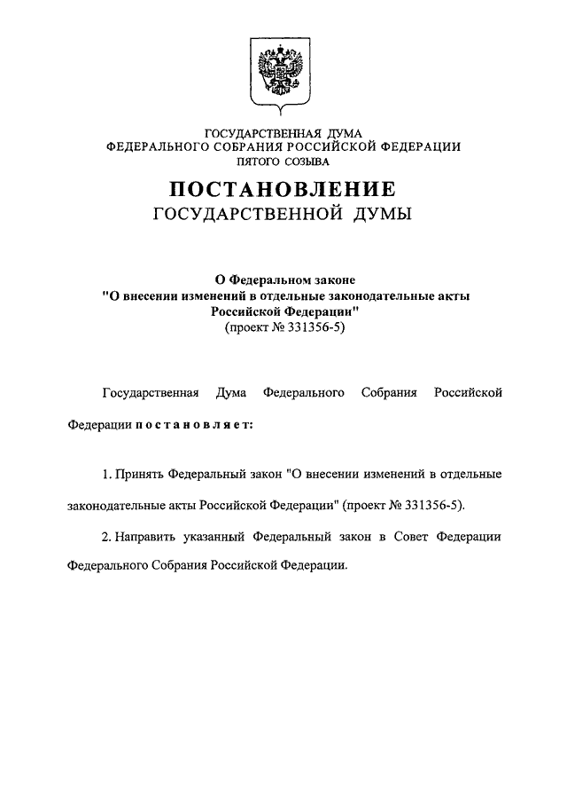 "О ФЕДЕРАЛЬНОМ ЗАКОНЕ "О ВНЕСЕНИИ ИЗМЕНЕНИЙ В ОТДЕЛЬНЫЕ ЗАКОНОДАТЕЛЬНЫЕ АКТЫ РОССИЙСКОЙ ФЕДЕРАЦИИ" (ПРОЕКТ N 331356-5)"