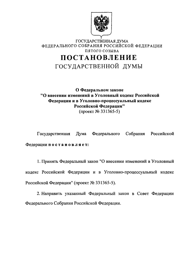 "О ФЕДЕРАЛЬНОМ ЗАКОНЕ "О ВНЕСЕНИИ ИЗМЕНЕНИЙ В УГОЛОВНЫЙ КОДЕКС РОССИЙСКОЙ ФЕДЕРАЦИИ И В УГОЛОВНО - ПРОЦЕССУАЛЬНЫЙ КОДЕКС РОССИЙСКОЙ ФЕДЕРАЦИИ" (ПРОЕКТ N 331365-5)"