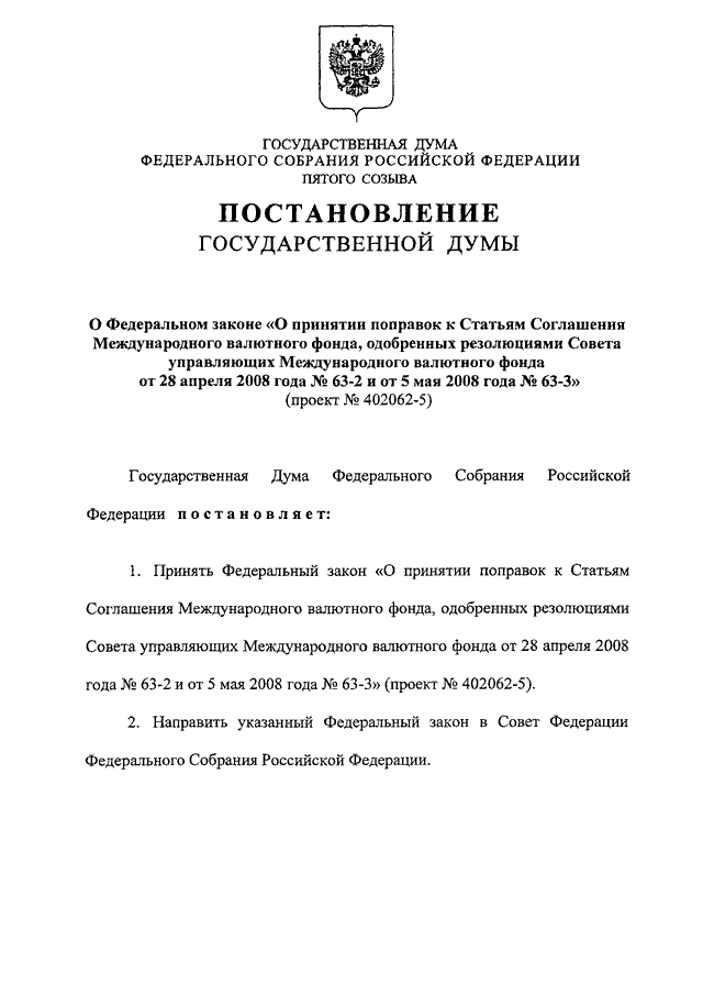 "О ФЕДЕРАЛЬНОМ ЗАКОНЕ "О ПРИНЯТИИ ПОПРАВОК К СТАТЬЯМ СОГЛАШЕНИЯ МЕЖДУНАРОДНОГО ВАЛЮТНОГО ФОНДА, ОДОБРЕННЫХ РЕЗОЛЮЦИЯМИ СОВЕТА УПРАВЛЯЮЩИХ МЕЖДУНАРОДНОГО ВАЛЮТНОГО ФОНДА ОТ 28 АПРЕЛЯ 2008 Г. N 63-2 И ОТ 5 МАЯ 2008 Г. N 63-3" (ПРОЕКТ N 402062-5)"