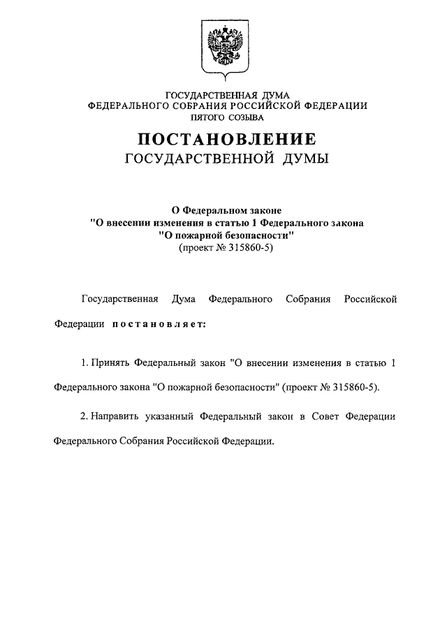 "О ФЕДЕРАЛЬНОМ ЗАКОНЕ "О ВНЕСЕНИИ ИЗМЕНЕНИЯ В СТАТЬЮ 1 ФЕДЕРАЛЬНОГО ЗАКОНА "О ПОЖАРНОЙ БЕЗОПАСНОСТИ" (ПРОЕКТ N 315860-5)"