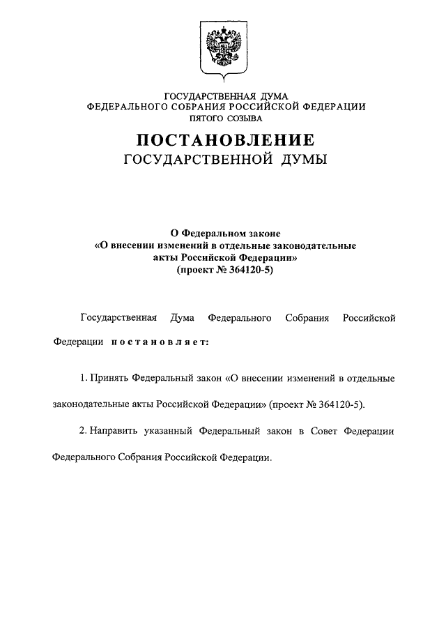 "О ФЕДЕРАЛЬНОМ ЗАКОНЕ "О ВНЕСЕНИИ ИЗМЕНЕНИЙ В ОТДЕЛЬНЫЕ ЗАКОНОДАТЕЛЬНЫЕ АКТЫ РОССИЙСКОЙ ФЕДЕРАЦИИ" (ПРОЕКТ N 364120-5)"