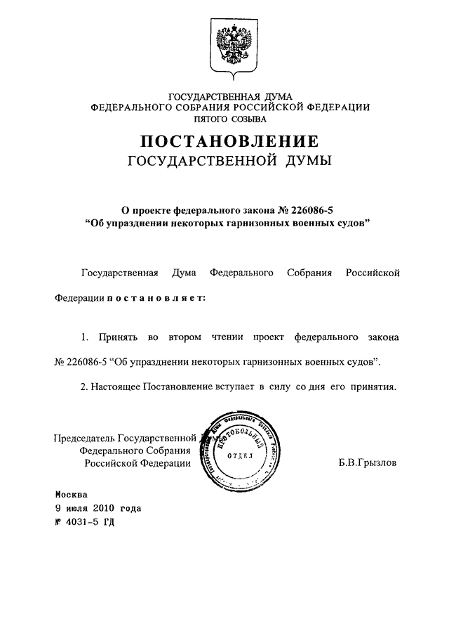 "О ПРОЕКТЕ ФЕДЕРАЛЬНОГО ЗАКОНА N 226086-5 "ОБ УПРАЗДНЕНИИ НЕКОТОРЫХ ГАРНИЗОННЫХ ВОЕННЫХ СУДОВ"