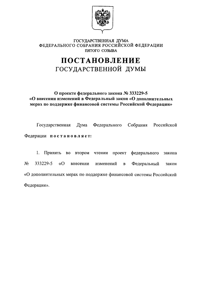 "О ПРОЕКТЕ ФЕДЕРАЛЬНОГО ЗАКОНА N 333229-5 "О ВНЕСЕНИИ ИЗМЕНЕНИЙ В ФЕДЕРАЛЬНЫЙ ЗАКОН "О ДОПОЛНИТЕЛЬНЫХ МЕРАХ ПО ПОДДЕРЖКЕ ФИНАНСОВОЙ СИСТЕМЫ РОССИЙСКОЙ ФЕДЕРАЦИИ"