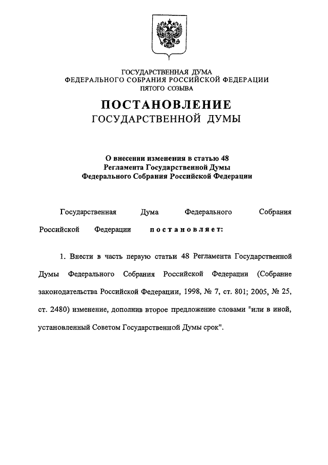 "О ВНЕСЕНИИ ИЗМЕНЕНИЯ В СТАТЬЮ 48 РЕГЛАМЕНТА ГОСУДАРСТВЕННОЙ ДУМЫ ФЕДЕРАЛЬНОГО СОБРАНИЯ РОССИЙСКОЙ ФЕДЕРАЦИИ"