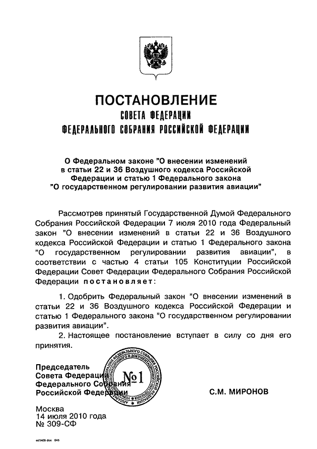 ПОСТАНОВЛЕНИЕ СФ ФС РФ от 14.07.2010 N 309-СФ