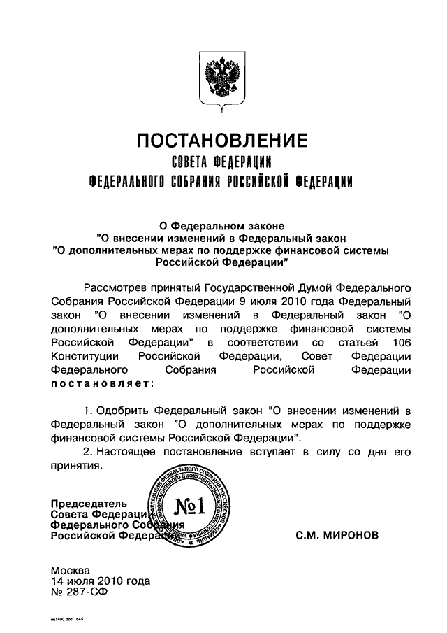 ПОСТАНОВЛЕНИЕ СФ ФС РФ от 14.07.2010 N 287-СФ