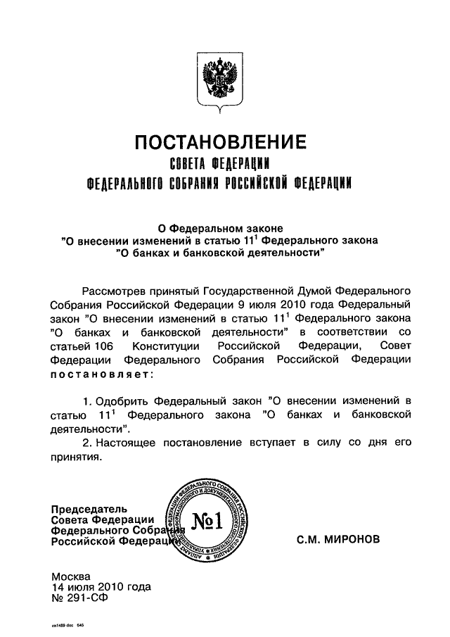 ПОСТАНОВЛЕНИЕ СФ ФС РФ от 14.07.2010 N 291-СФ
