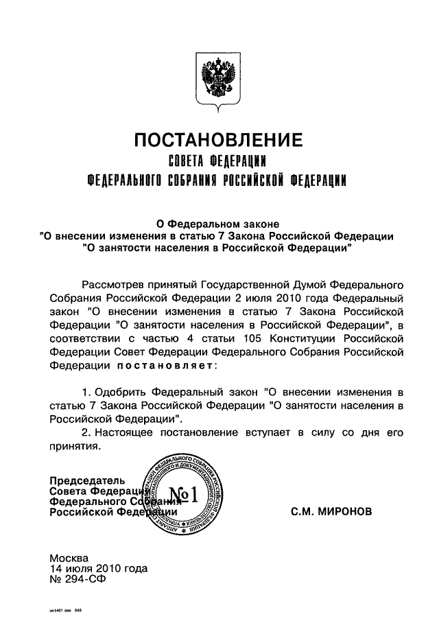 ПОСТАНОВЛЕНИЕ СФ ФС РФ от 14.07.2010 N 294-СФ
