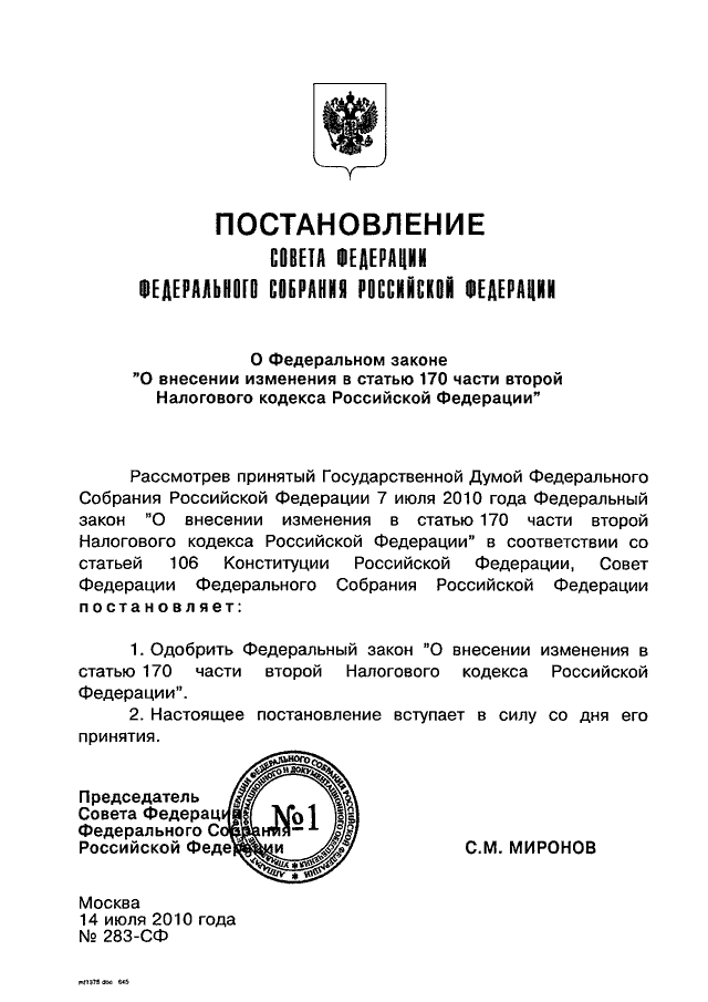 ПОСТАНОВЛЕНИЕ СФ ФС РФ от 14.07.2010 N 283-СФ