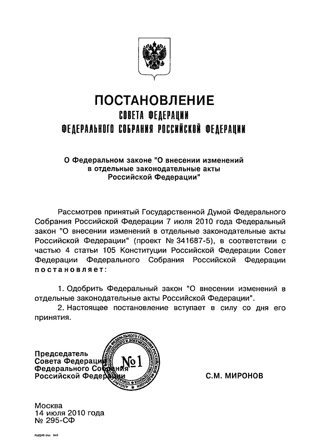 ПОСТАНОВЛЕНИЕ СФ ФС РФ от 14.07.2010 N 295-СФ