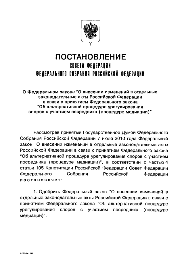 "О ФЕДЕРАЛЬНОМ ЗАКОНЕ "О ВНЕСЕНИИ ИЗМЕНЕНИЙ В ОТДЕЛЬНЫЕ ЗАКОНОДАТЕЛЬНЫЕ АКТЫ РОССИЙСКОЙ ФЕДЕРАЦИИ В СВЯЗИ С ПРИНЯТИЕМ ФЕДЕРАЛЬНОГО ЗАКОНА "ОБ АЛЬТЕРНАТИВНОЙ ПРОЦЕДУРЕ УРЕГУЛИРОВАНИЯ СПОРОВ С УЧАСТИЕМ ПОСРЕДНИКА (ПРОЦЕДУРЕ МЕДИАЦИИ)"