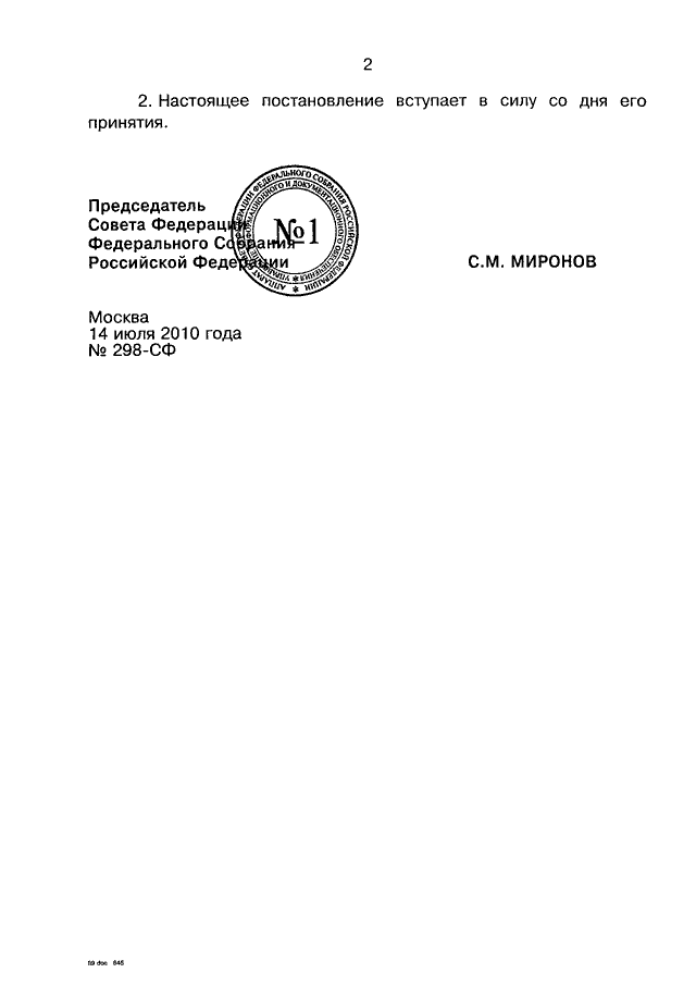 ПОСТАНОВЛЕНИЕ СФ ФС РФ от 14.07.2010 N 298-СФ