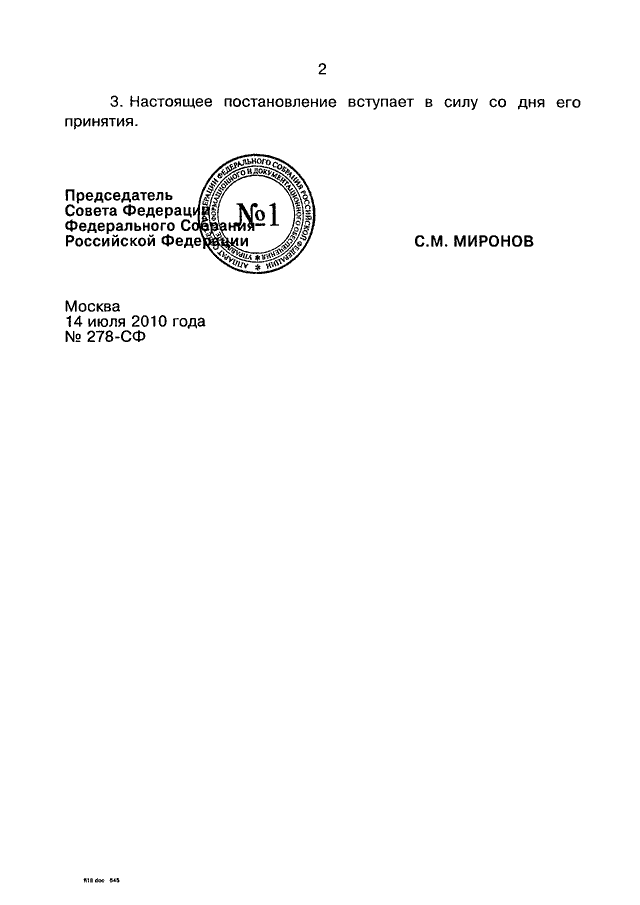 ПОСТАНОВЛЕНИЕ СФ ФС РФ от 14.07.2010 N 278-СФ