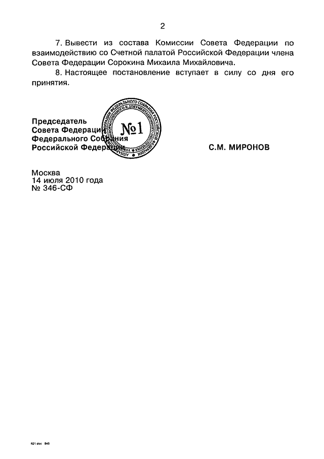 ПОСТАНОВЛЕНИЕ СФ ФС РФ от 14.07.2010 N 346-СФ