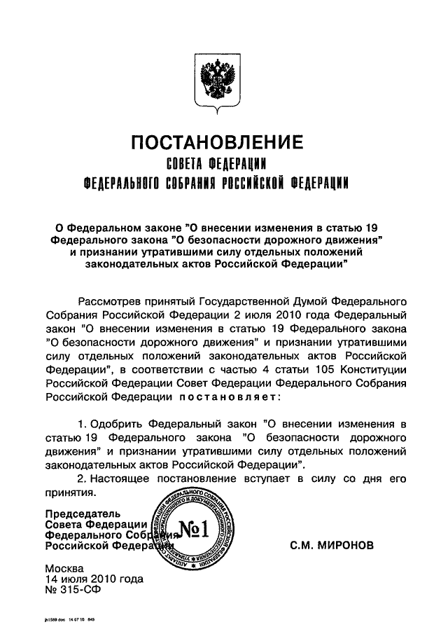 ПОСТАНОВЛЕНИЕ СФ ФС РФ от 14.07.2010 N 315-СФ