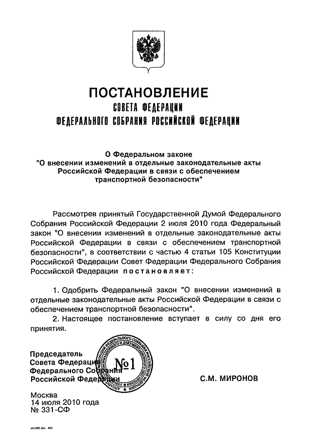 ПОСТАНОВЛЕНИЕ СФ ФС РФ от 14.07.2010 N 331-СФ