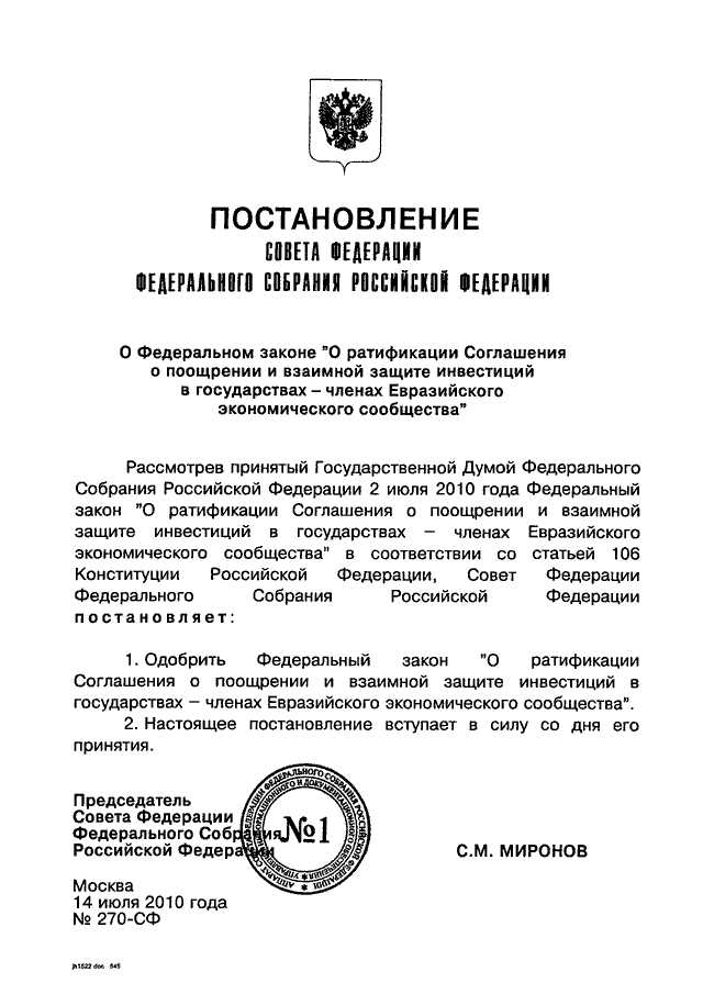 ПОСТАНОВЛЕНИЕ СФ ФС РФ от 14.07.2010 N 270-СФ
